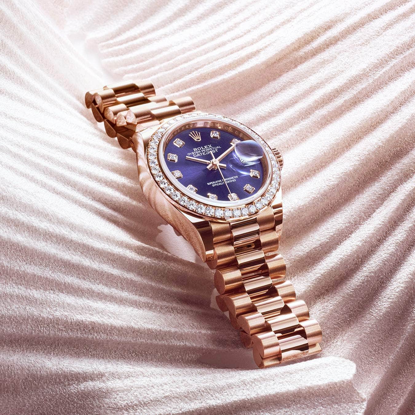 sunray-finish dials, paved with diamonds or crafted from mother-of-pearl - the Lady-Datejust offers so many choices that wearers can easily find one to reflect their personality. Depending on the version, the Lady-Datejust is available with a domed, fluted or diamond-set bezel.