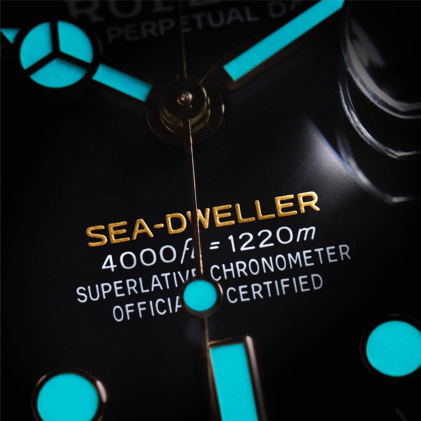 The Chromalight display, exclusive to Rolex, gives the Sea-Dweller optimal legibility in any circumstances. The hour markers, hands, capsule and bezel are filled or covered by hand with a luminescent material that emits an intense blue glow in the dark that lasts up to two times longer than traditional phosphorescent materials.