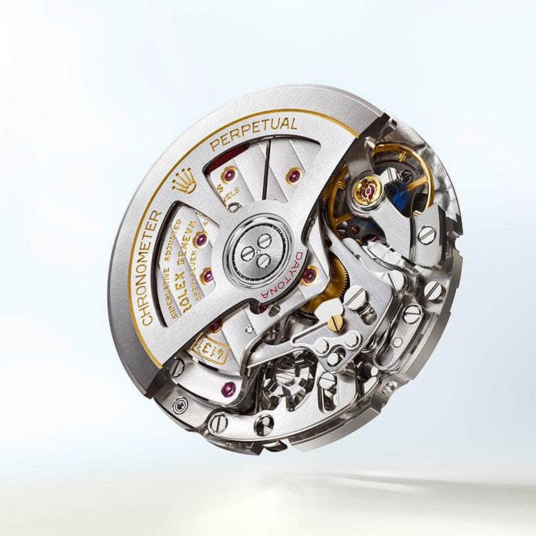 The Cosmograph Daytona is equipped with calibre 4131, entirely developed and manufactured by Rolex, which features bridges decorated with Rolex Côtes de Genève and a cut-out oscillating weight. Calibre 4131 enables the Cosmograph Daytona to measure intervals of time via the chronograph function, in addition to displaying the hours, minutes and seconds.