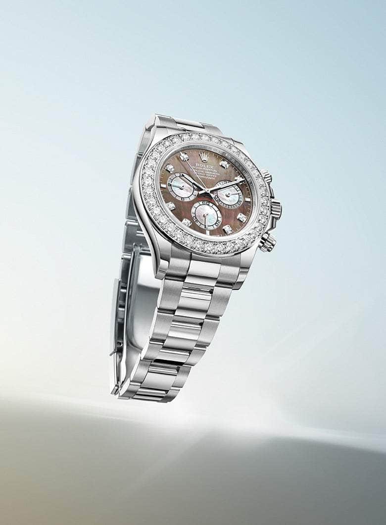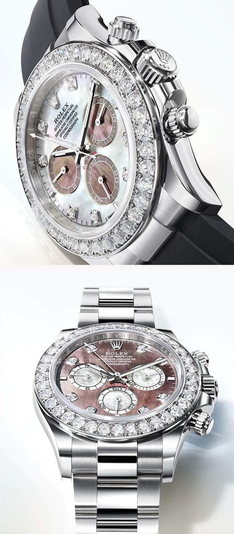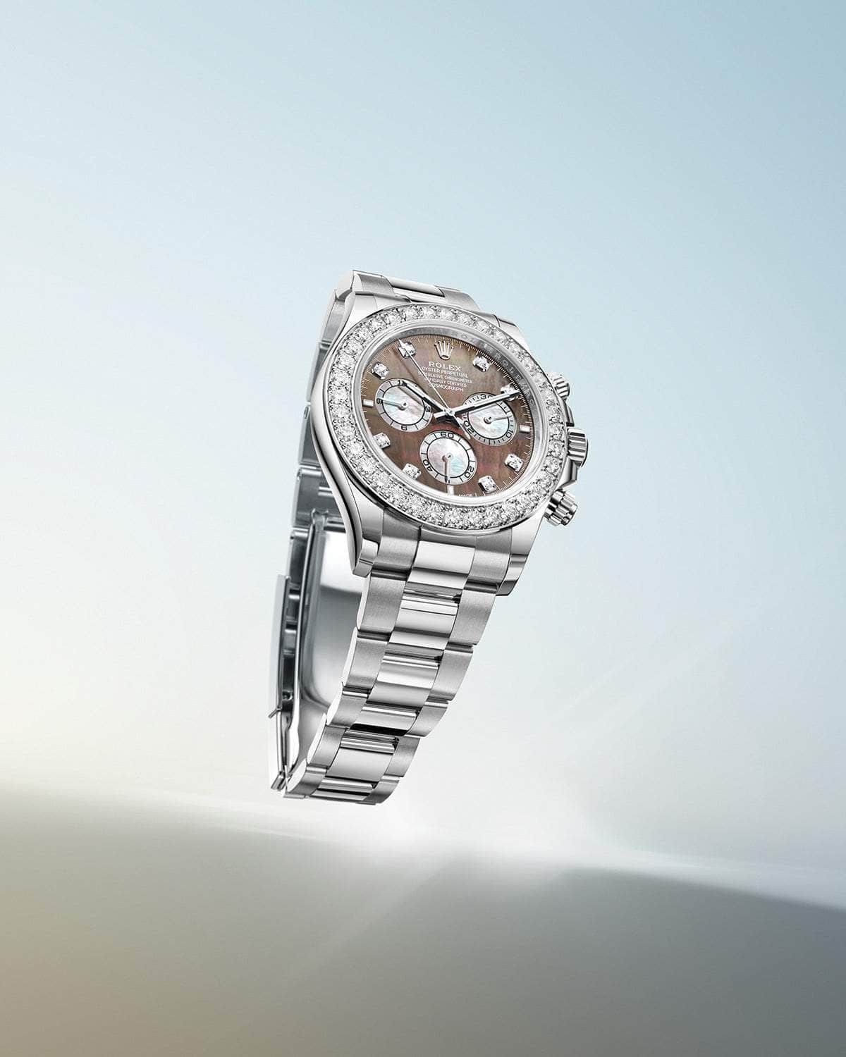 Rolex is unveiling two new precious and exclusive versions of the Oyster Perpetual Cosmograph Daytona in 18 ct white gold with contrasting dials made from natural mother-of-pearl and graced with eight diamonds and three Chromalight hour markers. Both watches are crafted in 18ct white gold and crowned with a bezel set with 36 brilliant-cut diamonds.