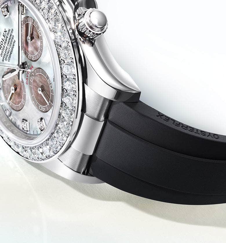 The first version, fitted on an Oysterflex bracelet, features a dial in white mother-of-pearl with chronograph counters in black mother-of-pearl. The colour combination is reversed on the second watch, which has an Oyster bracelet and a black mother-of-pearl dial with white mother-of-pearl counters. This design called for the creation of a specific and technically demanding manufacturing process.