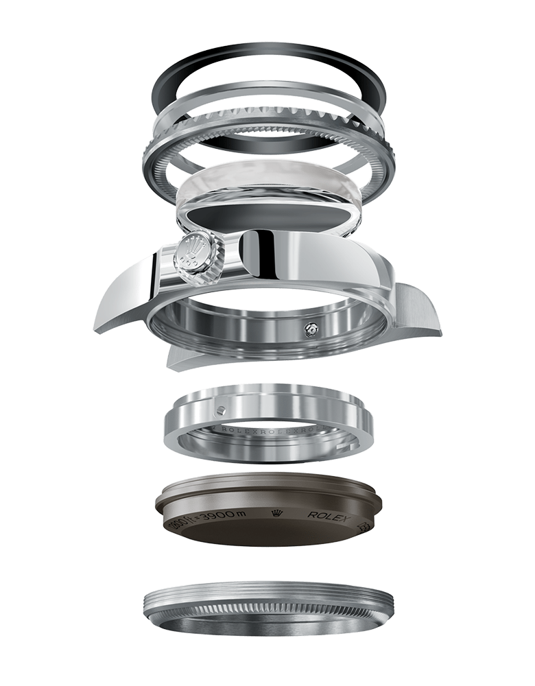 Rolex’s patented Ringlock system equips the brand’s divers’ watches designed for extreme depths, the Rolex Deepsea and the Deepsea Challenge. An extension of the research dedicated to the waterproofness of the Oyster, this system is a reinforced case architecture comprising a thick, slightly domed sapphire crystal, a high-performance compression ring, and a case back made from RLX titanium.