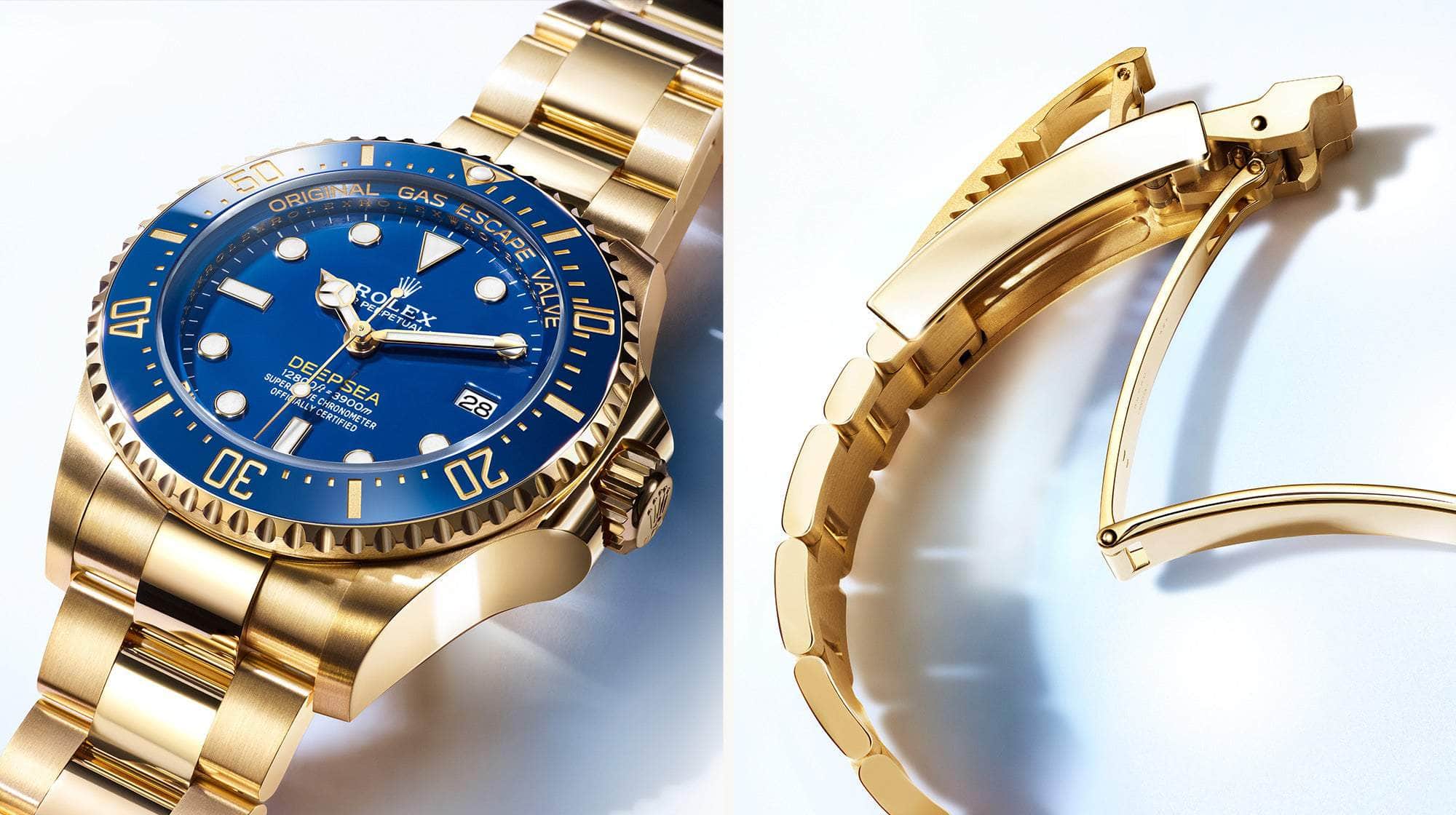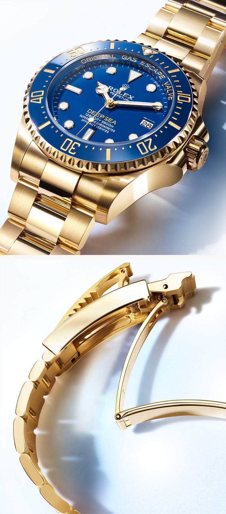 The Rolex Deepsea in 18 ct yellow gold is fitted on an Oyster bracelet. Developed at the end of the 1930s, this three-piece link metal bracelet is known for its robustness; it remains the most universal bracelet in the Oyster Perpetual collection.