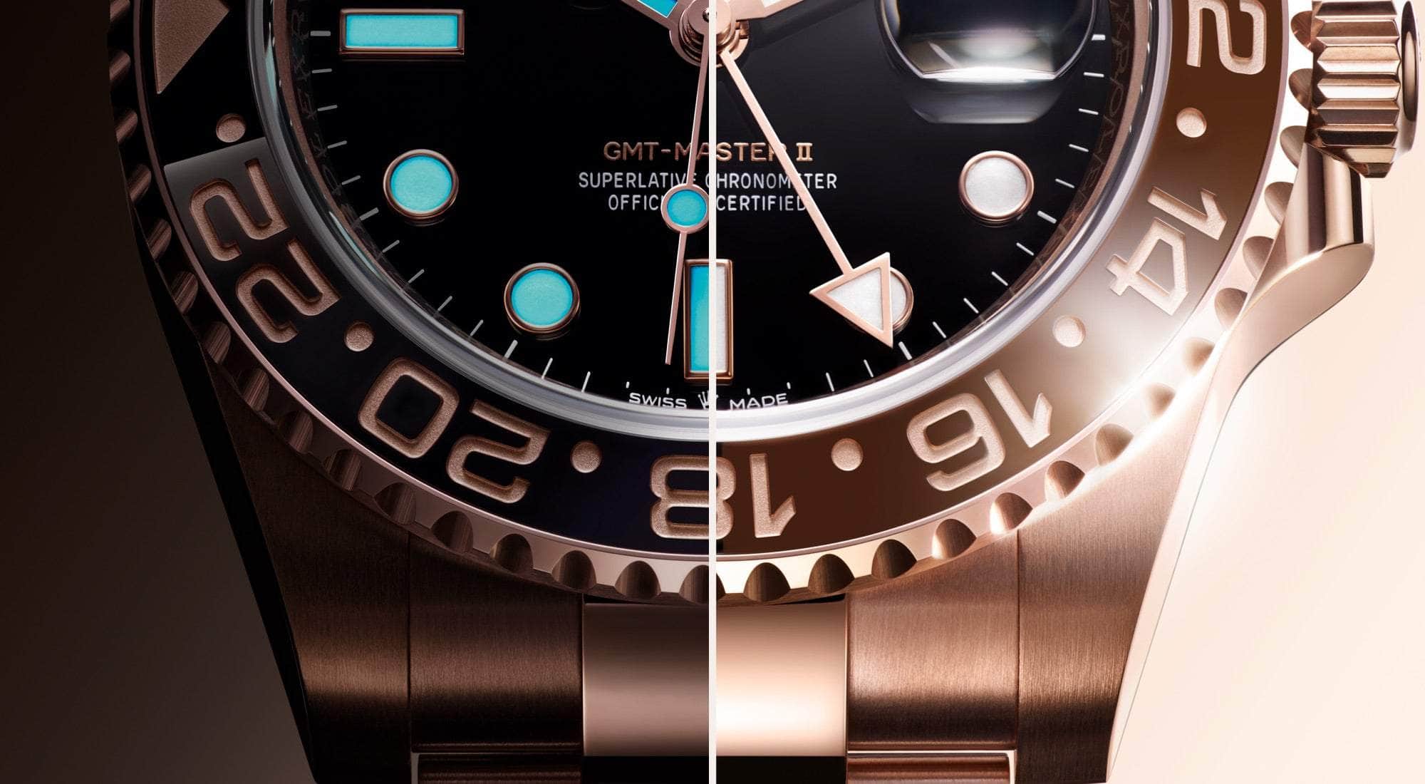 The GMT-Master II has an instantly recognisable design with a graduated bezel insert, which is available in various dual-colour combinations – the lower half symbolising daytime and the upper signalling night time. With traditional hour, minute and seconds hands, its triangle-tipped 24-hour hand and bidirectional rotatable bezel with a 24-hour graduated Cerachrom insert, the GMT-Master II can display the time in two time zones simultaneously: either the local time and the reference time, or the local time and that of an alternative time zone.