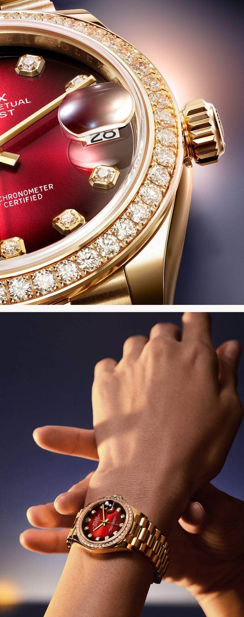 On the watch presented, the red ombré dial is adorned with ten diamond-set hour markers and showcased by a bezel set with 46 brilliant-cut diamonds, paired with a President bracelet with concealed Crownclasp.