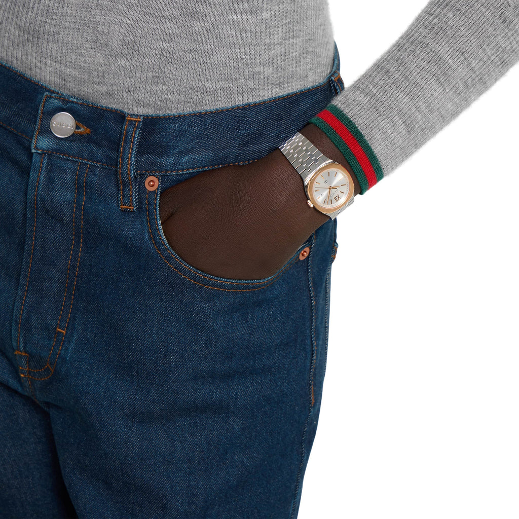 The GUCCI 25H collection showcases a streamlined silhouette, featuring refined elements that enhance the watch's sleek design. Powered by a quartz movement, the accessory is defined by a steel interchangeable bracelet and a stainless steel case with pink gold-toned bezel.