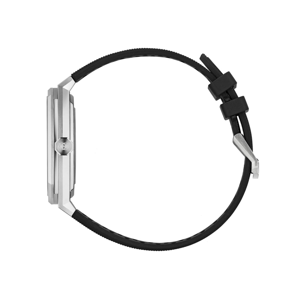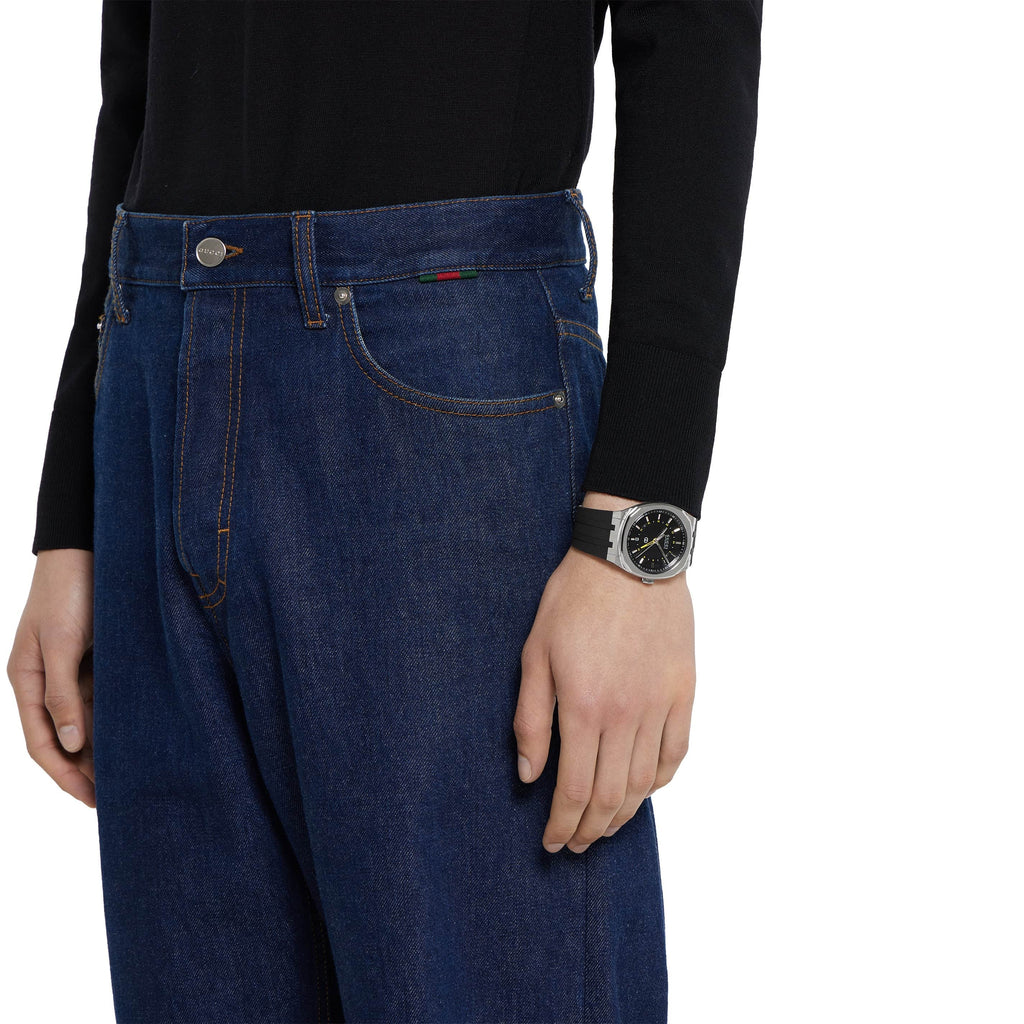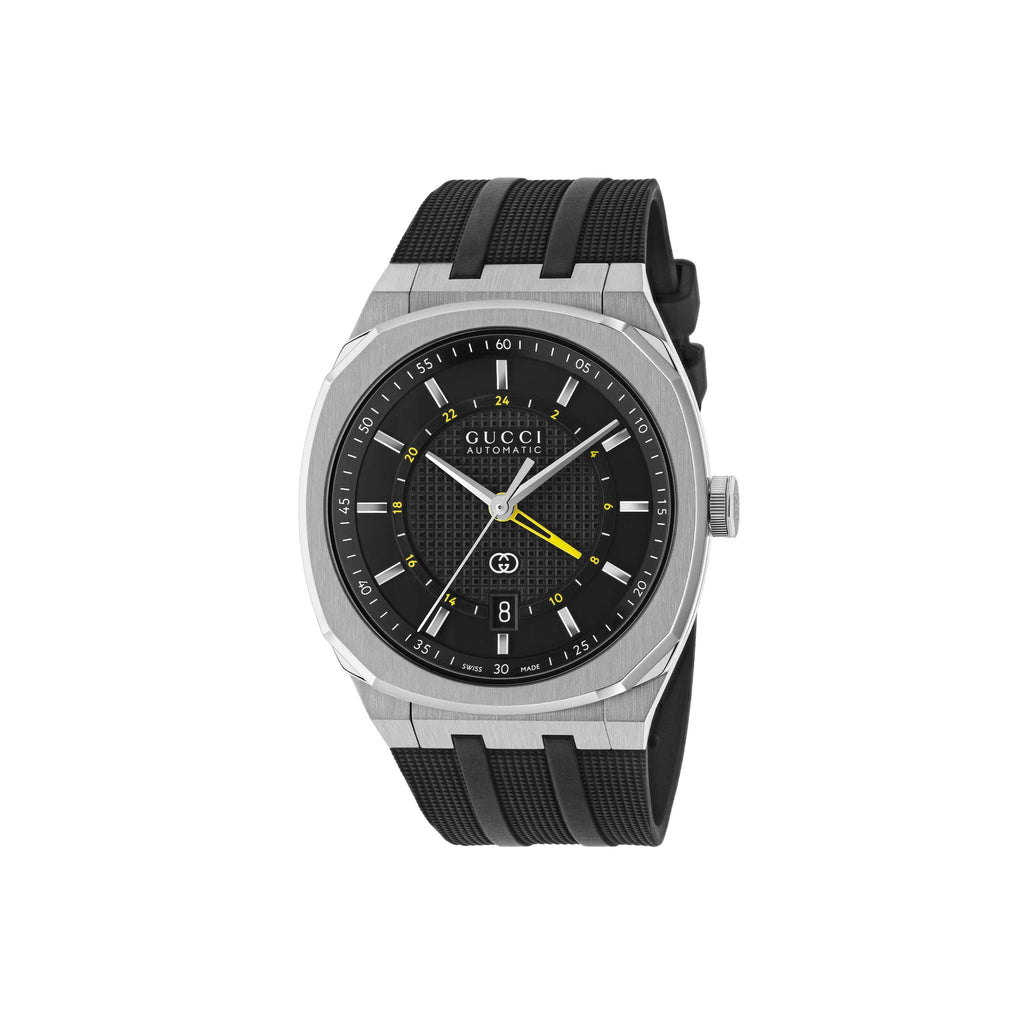 The balck rubber strap offers comfort and adaptability, securing with a pin buckle for ease of use. Water-resistant up to 50 metres, this watch caters to an active lifestyle while maintaining its luxurious appearance. With a power reserve of 50 hours, the Gucci 25H YA163353 combines practicality with timeless design.