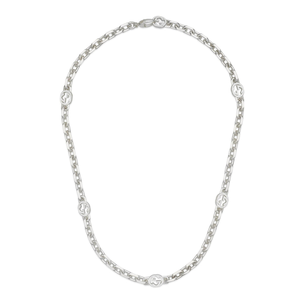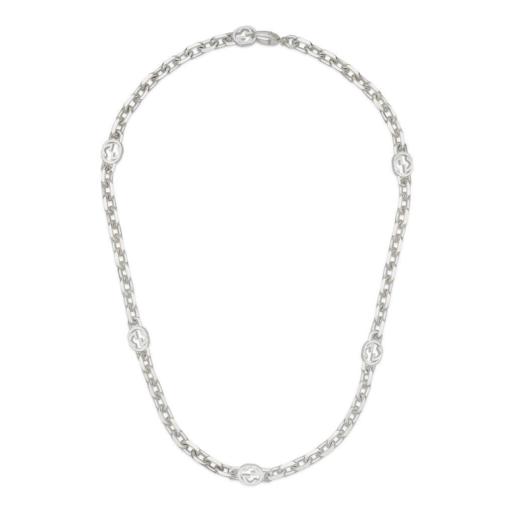 Elevate your style with the GUCCI Interlocking G Silver Necklace, a refined accessory that blends timeless design with luxury craftsmanship. Made from high-quality silver, its polished finish highlights the iconic Interlocking G motif, symbolizing Gucci's heritage. Designed to rest gracefully around the neck, this necklace complements both formal attire and everyday looks.