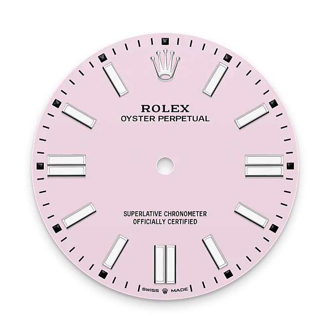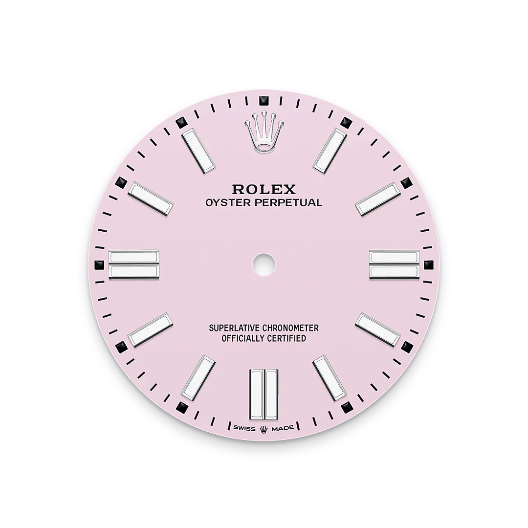 The colours created for the Oyster Perpetual range start life as a lacquer, which must be meticulously applied in a controlled-atmosphere environment to avoid dust and other contamination. The brass plate of the dial base receives layer upon layer of lacquer, six in all, to form a regular, uniform surface. The last step is varnishing and polishing to bring out the full brilliance and depth of colour. The various inscriptions are then pad printed, and the hour markers and crown riveted by hand. The dial, gleaming in its perfection, is all set to take its place on top of the movement at the watch assembly phase.