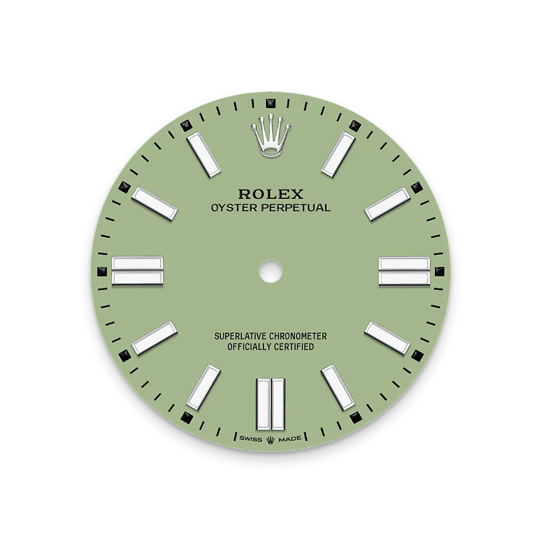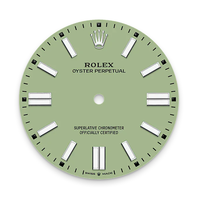 The colours created for the Oyster Perpetual range start life as a lacquer, which must be meticulously applied in a controlled-atmosphere environment to avoid dust and other contamination. The brass plate of the dial base receives layer upon layer of lacquer, six in all, to form a regular, uniform surface. The last step is varnishing and polishing to bring out the full brilliance and depth of colour. The various inscriptions are then pad printed, and the hour markers and crown riveted by hand. The dial, gleaming in its perfection, is all set to take its place on top of the movement at the watch assembly phase.