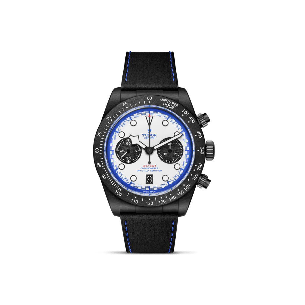 TUDOR has been tied to motorsport since the ‘50s. The Black Bay Chrono “Carbon 25”—with a case rendered entirely in carbon fibre, including the end-links, with titanium pushers—marks a long history of TUDOR going wheel-to-wheel with racing teams. The aesthetic codes present in the watch mirror those of the 2025 season livery on the Visa Cash App Racing Bulls Formula One Team car.